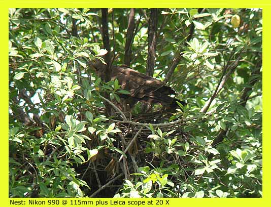 The rectangular box is where the nest is with wideangle lens without spotting scope and the next picture shows the Crested Honey-Buzzard in the nest when digiscoped.